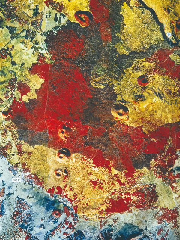 騰沖火山地貌遙感影像,紅色部分表示植被。