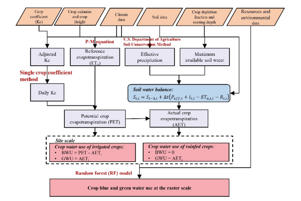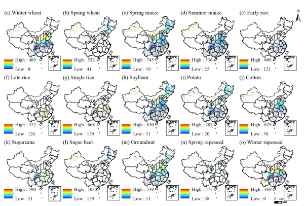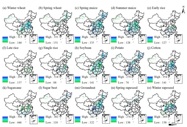 為此,史文嬌研究團隊基于中國1991-2019年長時間序列的動態(tài)氣象數(shù)據(jù)和農(nóng)作物生長發(fā)育數(shù)據(jù),結(jié)合動態(tài)水平衡模型和隨機森林模型,繪制了中國1991-2019年1km分辨率15種主要作物(冬小麥、春小麥、春玉米、夏玉米、早稻、中稻、晚稻、大豆、花生、馬鈴薯、棉花、冬油菜、春油菜、甜菜和甘蔗)逐年藍(lán)水和綠水的數(shù)據(jù)產(chǎn)品。