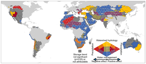 圖2. 地表水儲量對降水變化、流域水文過程和人類水資源管理的長期響應。
