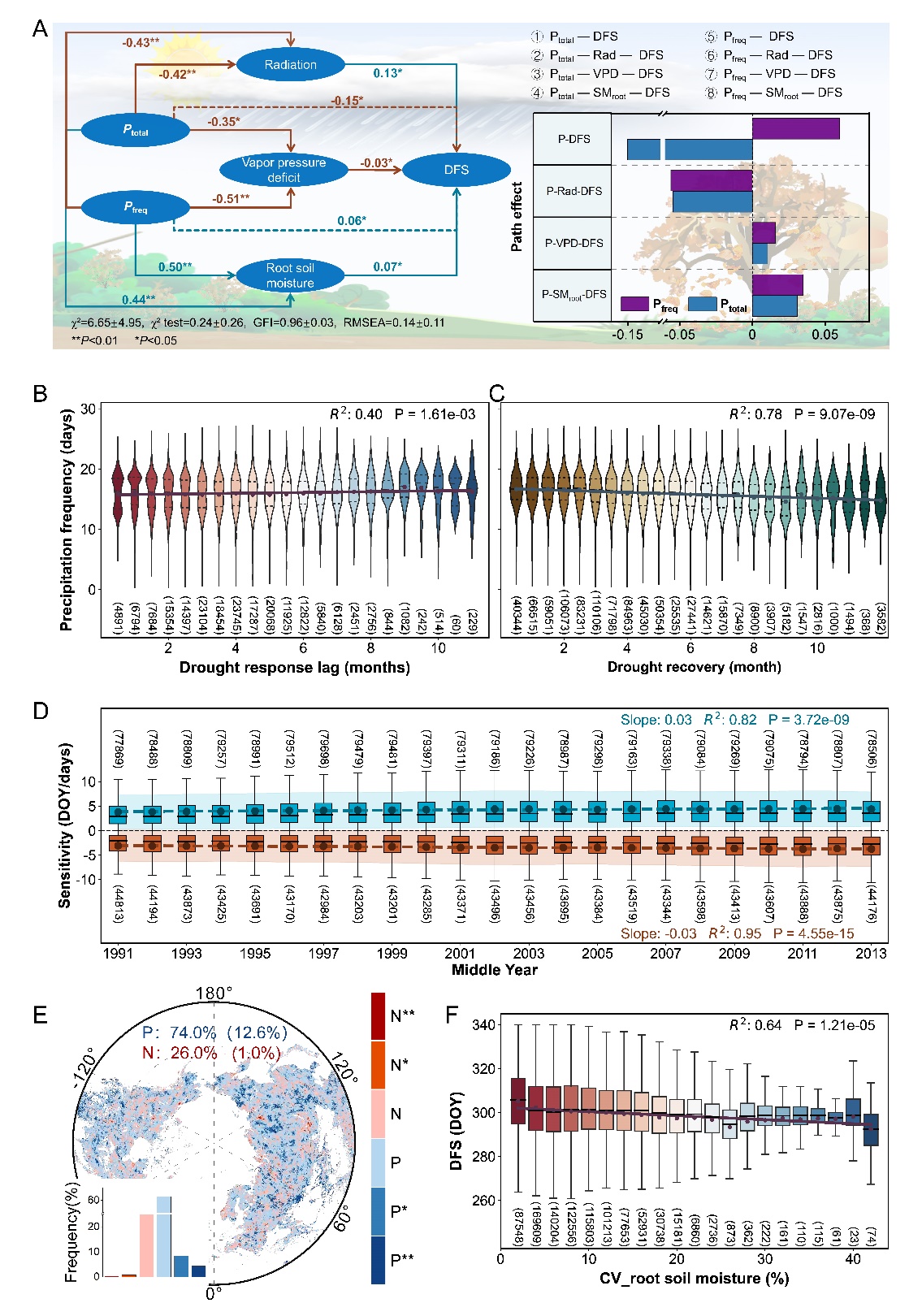 植被物候是氣候變化最直接最敏感的指示器,是監(jiān)測區(qū)域乃至全球尺度植被生態(tài)系統(tǒng)變化的關(guān)鍵指標(biāo)之一。全球氣候變化通過影響植被物候期,改變生態(tài)系統(tǒng)結(jié)構(gòu)和功能,進(jìn)而影響生態(tài)系統(tǒng)與大氣之間碳、水和能量交換。因此,準(zhǔn)確評估和預(yù)測氣候變化對植被物候的影響,對于深入了解全球氣候變化和陸地生態(tài)系統(tǒng)具有十分重要的意義。過去幾十年,全球變暖導(dǎo)致春季物候顯著提前,而秋季物候的影響因素較為復(fù)雜,導(dǎo)致現(xiàn)有模型對秋季物候模擬與預(yù)測的精度普遍偏低。中國科學(xué)院地理科學(xué)與資源研究所汪簫悅副研究員、吳朝陽研究員等聯(lián)合中國科學(xué)院空天信息創(chuàng)新研究院、北京大學(xué)、北京師范大學(xué)、華東師范大學(xué)以及美國、歐洲等國家的全球變化領(lǐng)域科研人員開展了降水頻率對植被秋季物候的影響研究。